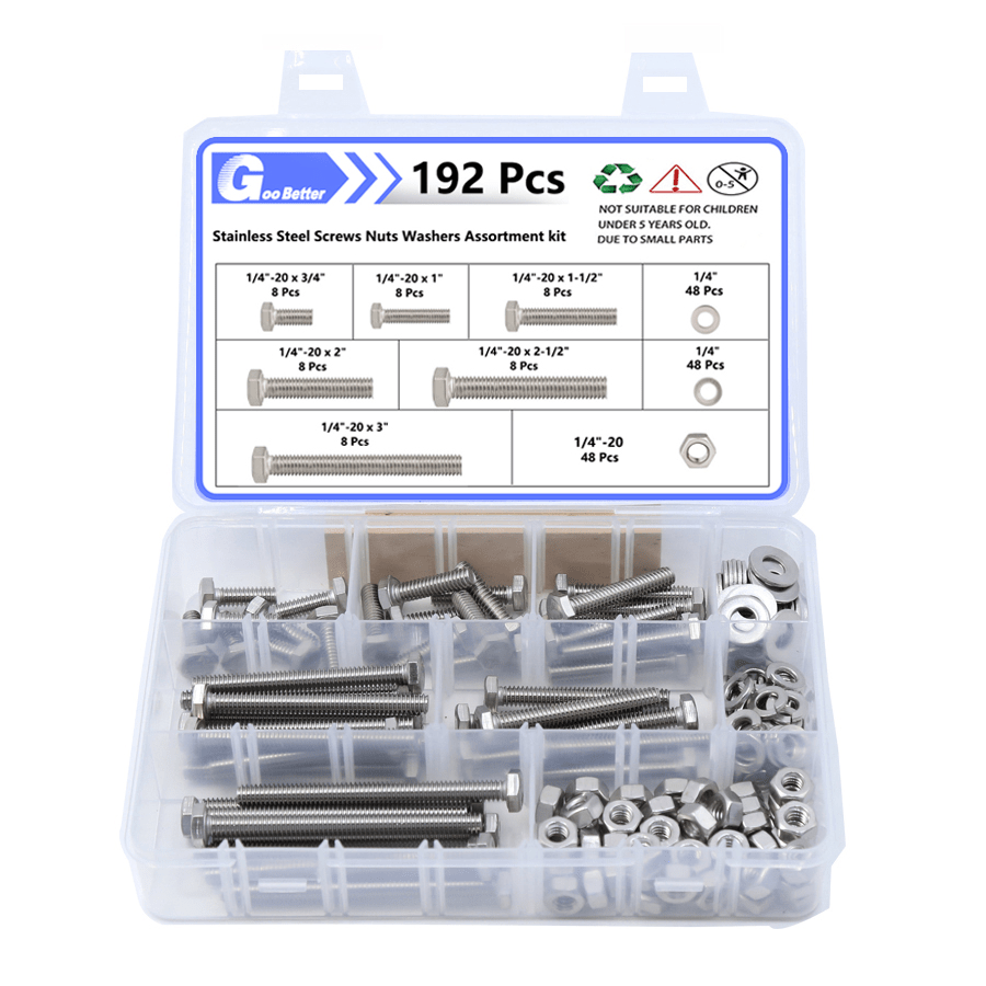 192Pcs 1/4'' - 20 Hex Head Bolts And Nut & Washer Assortment Kit A2 Stainless Steel - HomeDIYer