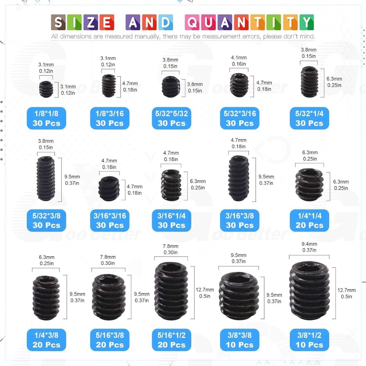 „Paket enthält“: Wir bieten ein 370-teiliges Sechskant-Madenschrauben-Set in 15 Größen. 1/8¡¯¡¯ x 1/8¡¯¡¯, 1/8¡¯¡¯ x 3/16¡¯¡¯, 5/32¡¯¡¯ x 3/16¡¯¡¯, 5/32¡¯¡¯ x 5/32¡¯¡¯, 5/32¡¯¡¯ x 1/4¡¯¡¯, 5/32¡¯¡¯ x 3/8¡¯¡¯, 3/16¡¯¡¯ x 3/16¡¯¡¯, 3/16¡¯¡¯ x 1/4¡¯¡¯ und 3/16¡¯¡¯ x 3/8¡¯¡¯, jeweils für 30 Stück. 1/4¡¯¡¯ x 1/4¡¯¡¯, 1/4¡¯¡¯ x 3/8¡¯¡¯, 5/16¡¯¡¯ x 3/8¡¯¡¯ und 5/16¡¯¡¯ x 1/2¡¯¡¯, jeweils für 20 Stück. 3/8¡¯¡¯ x 3/8¡¯¡¯ und 3/8¡¯¡¯ x 1/2¡¯¡¯, jeweils für 10 Stück. Es ist bequemer und günstiger, als Schrauben in einzelnen Größen im Geschäft zu kaufen. „Hohe Festigkeit“ Legierter Stahl der Klasse 12.9 hält extrem hoher Festigkeit stand. Selbst wenn er wiederholt angezogen oder gelöst wird, verformt sich der Kopf der Sechskantschraube nicht, was Ihnen die Installation der Schraube sehr erleichtert. Sie können sie in Umgebungen mit hohem Druck verwenden, sie sind stark genug, um dem größten Druck von Geräten und Teilen standzuhalten. „Gute Verarbeitung“ Unsere Innensechskant-Steckschlüssel werden nach strengen Standards hergestellt, daher ist auch die Größe des Innensechskants sehr genau. Dadurch wird der Innensechskant gleichmäßig beansprucht, der Anzugseffekt kann maximiert werden und er fällt aufgrund von Vibrationen oder anderen Gründen nicht so leicht ab. ¡¾Sauberes Gewinde¡¿Die Schrauben sind gut verarbeitet, mit sauberen und ordentlichen Gewinden, und die Schnittstelle ist glatt und flach ohne Grate, sodass andere Teile nicht beschädigt werden. Darüber hinaus gibt es keine Lücken in den Gewindeteilen, sodass sie lange Zeit verwendet werden können, ohne zu reißen oder zu brechen. „Vielseitig einsetzbar“ Dieses Set ist ein Muss für Dekorateure, Klempner und normale Haushalte. Sie können damit Türgriffe, Wasserhähne, Holzmöbel und geklebte Böden reparieren. Natürlich können Sie damit auch rostige oder kaputte Schrauben in kleinen Geräten ersetzen.