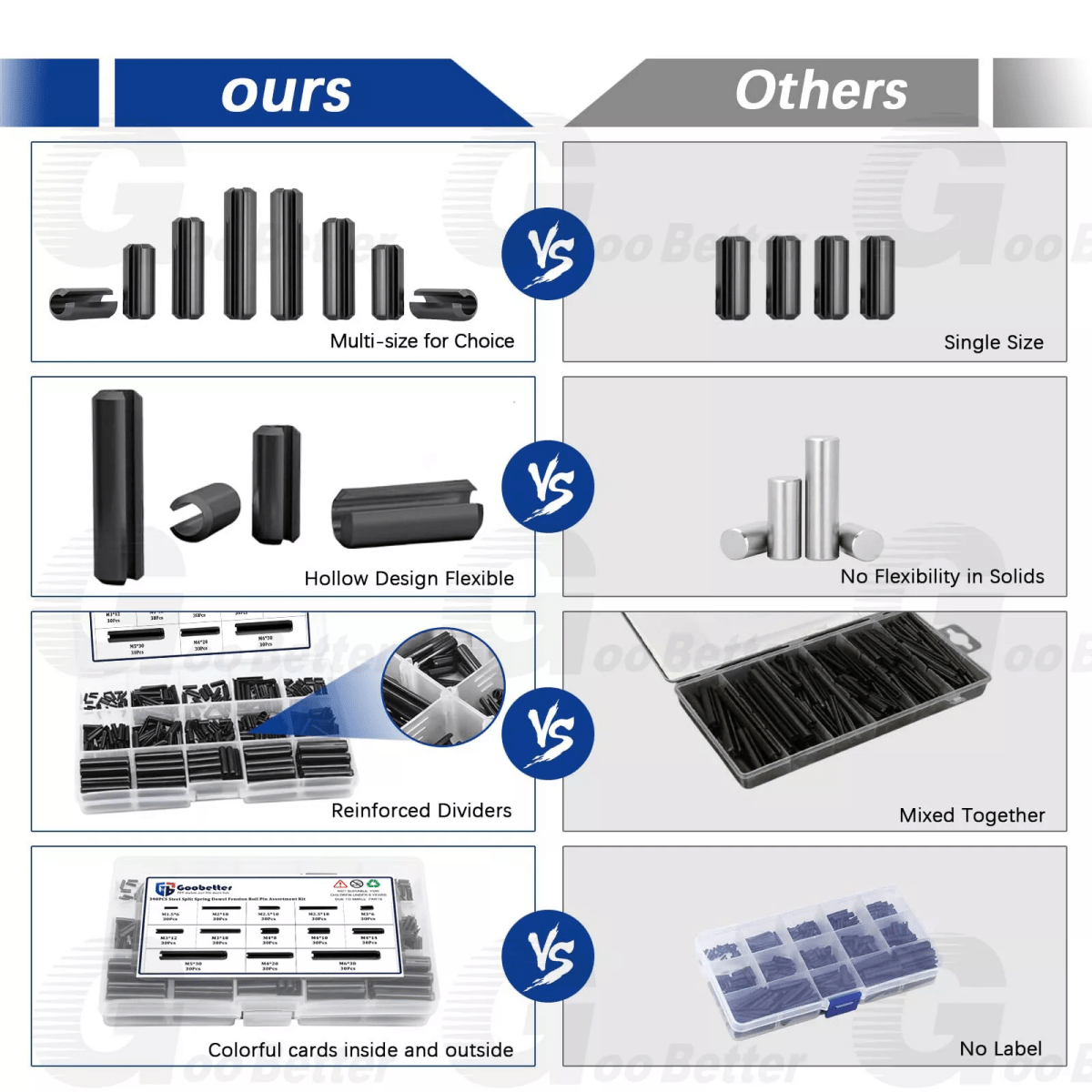Das Spannstift-Set besteht aus hochdichtem Stahl und bietet hervorragende Befestigungseffekte. Die Metallstifte bestehen aus Federstahl für Flexibilität, Ausgewogenheit und Langlebigkeit. Die schwarze Oxidbeschichtung ist korrosionsbeständig.