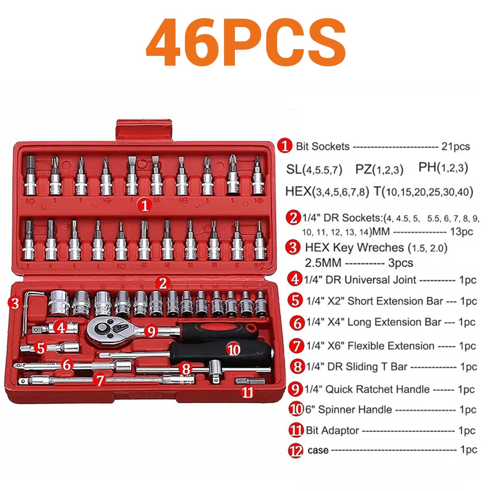 46PCS 1/4 Socket Ratchet Wrench Set Impact Socket Bit Kit Automotive Repair Tool - HomeDIYer
