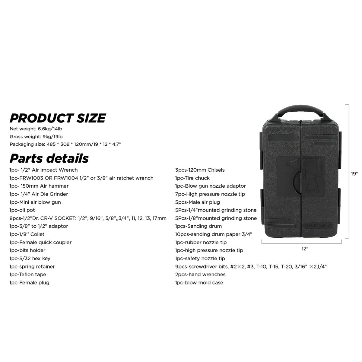 • We've included a heavy-duty blow molded case to ensure that your air toolset is always protected and organized. This sturdy case not only keeps your tools safe during storage and transportation but also allows for easy access and quick identification of each piece. Stay organized and keep your tools in pristine condition with our thoughtfully designed case