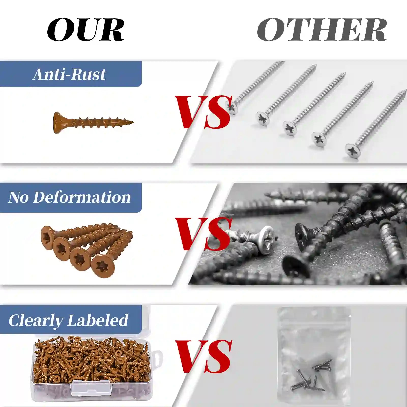 3. 【Aggressives Gewinde + selbstschneidende Spitze】: Diese Terrassenschrauben für den Außenbereich sind nicht vorbohrbar und verfügen über eine selbstschneidende Spitze und ein grobes Gewinde, wodurch die Schneidkraft verbessert wird. Sie sind die perfekte Wahl für behandelte Terrassen, Zäune und andere Holzprojekte im Außenbereich.