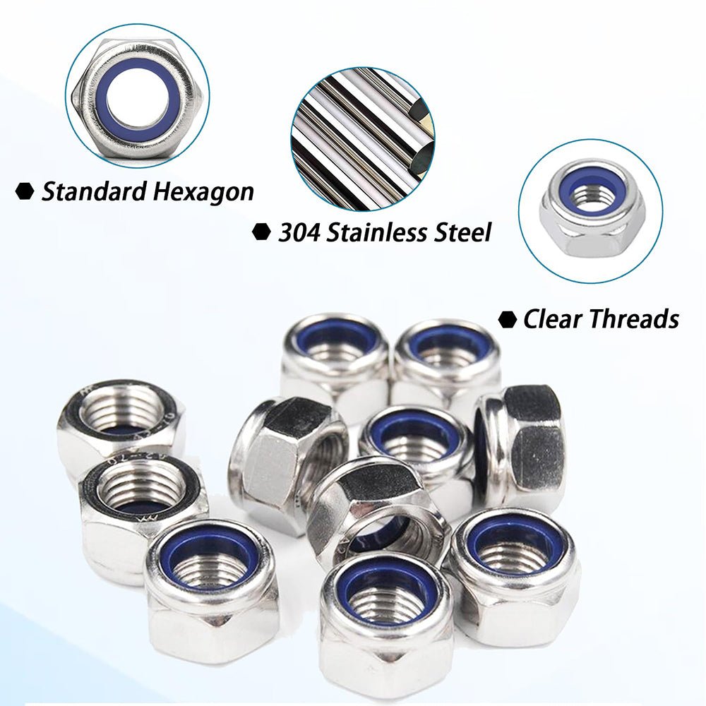 [Sicherungsmuttern mit Nyloneinsätzen]: Die Sicherungsmuttern sind mit Nyloneinsätzen versehen, sodass sie eng an das Bolzengewinde anliegen und die Elastizität des Nylons Reibungswiderstand bietet, um ein Lösen zu verhindern. Überlegene Vibrationsfestigkeit, Abrieb- und Scherfestigkeit sowie gute Leistung bei wiederholtem Gebrauch