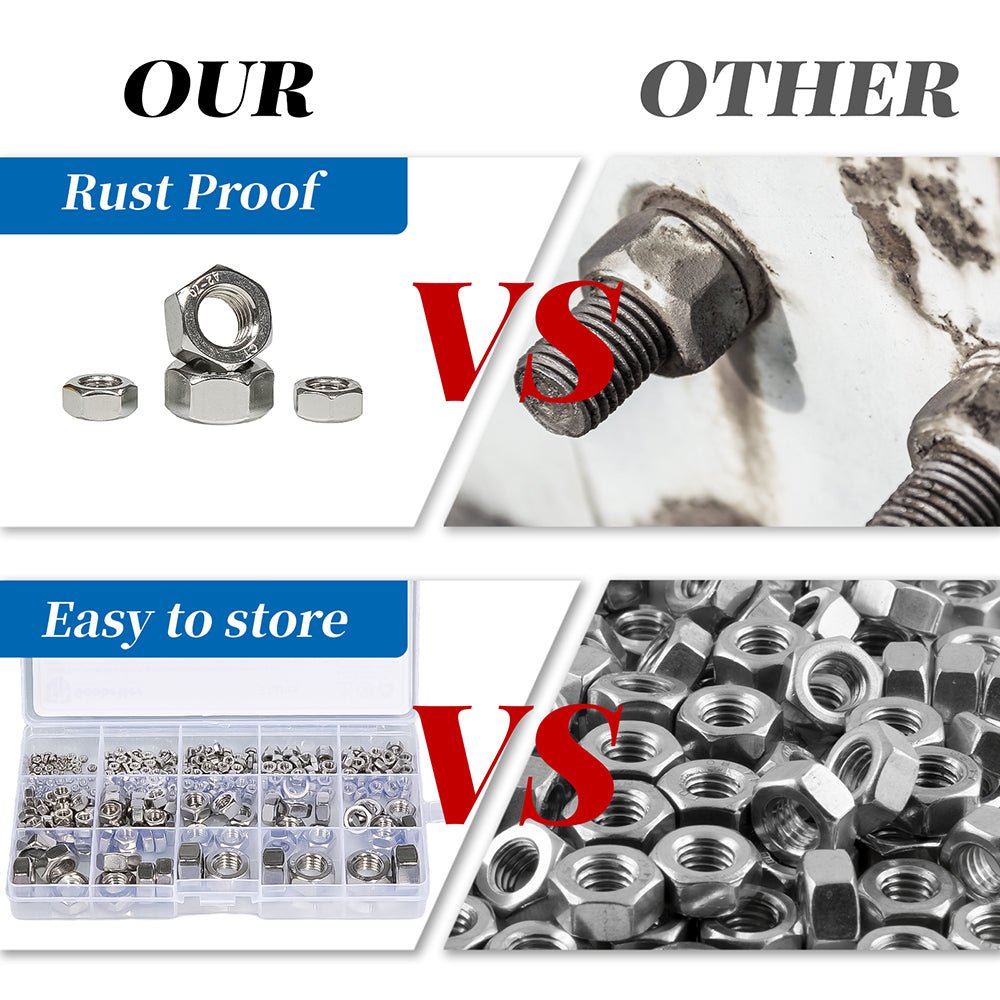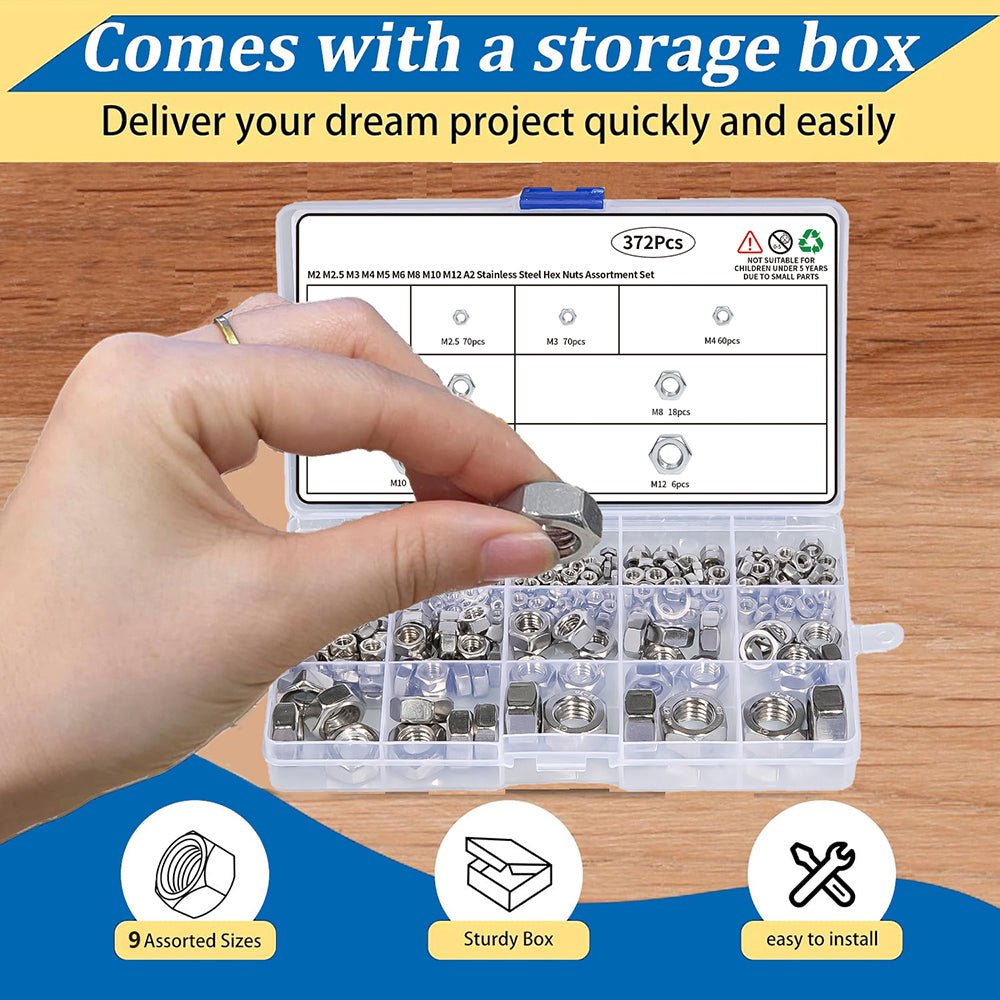 M2 M2.5 M3 M4 M5 M6 M8 - M12 372Pcs 304 Stainless Steel Metric Hex Nuts Assortment Set - HomeDIYer