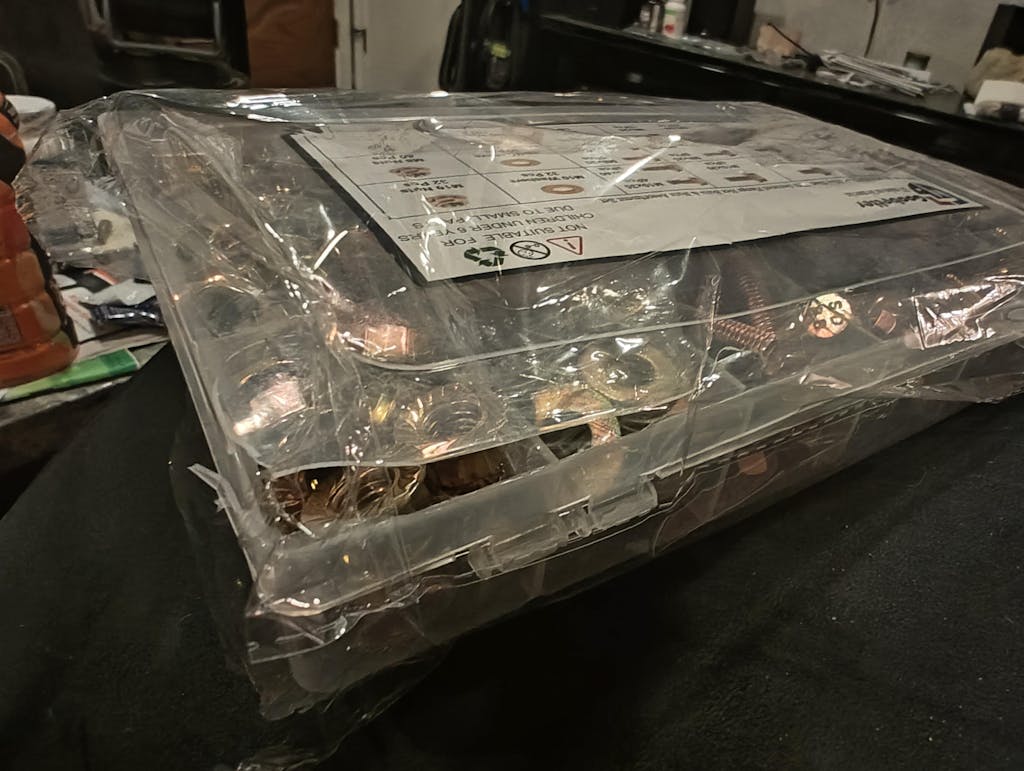 I honestly ordered these thinking they’re just something to have on hand when you’re missing a bolt or a washer or a nut, and you need a spare, and of course, as is the case in the natural order of these things, it’s going to be inferior quality, but it’ll get the job done. I have kissed enough toads in the kingdom of fasteners to have fairly low expectations. But I can also recognize a prince when I see one. These are actually nice! These are “maybe I should build a workbench!“ level of inspiration. They’ve even included a cute little pair of tweezers for positioning, the lock washers, at least that’s what I assume therefore. I’m not even really sure. I’ve just got tweezers now. I love nice surprises. The box is a little tricky to re-fasten, but finesse it, don’t force it, and it will shut.