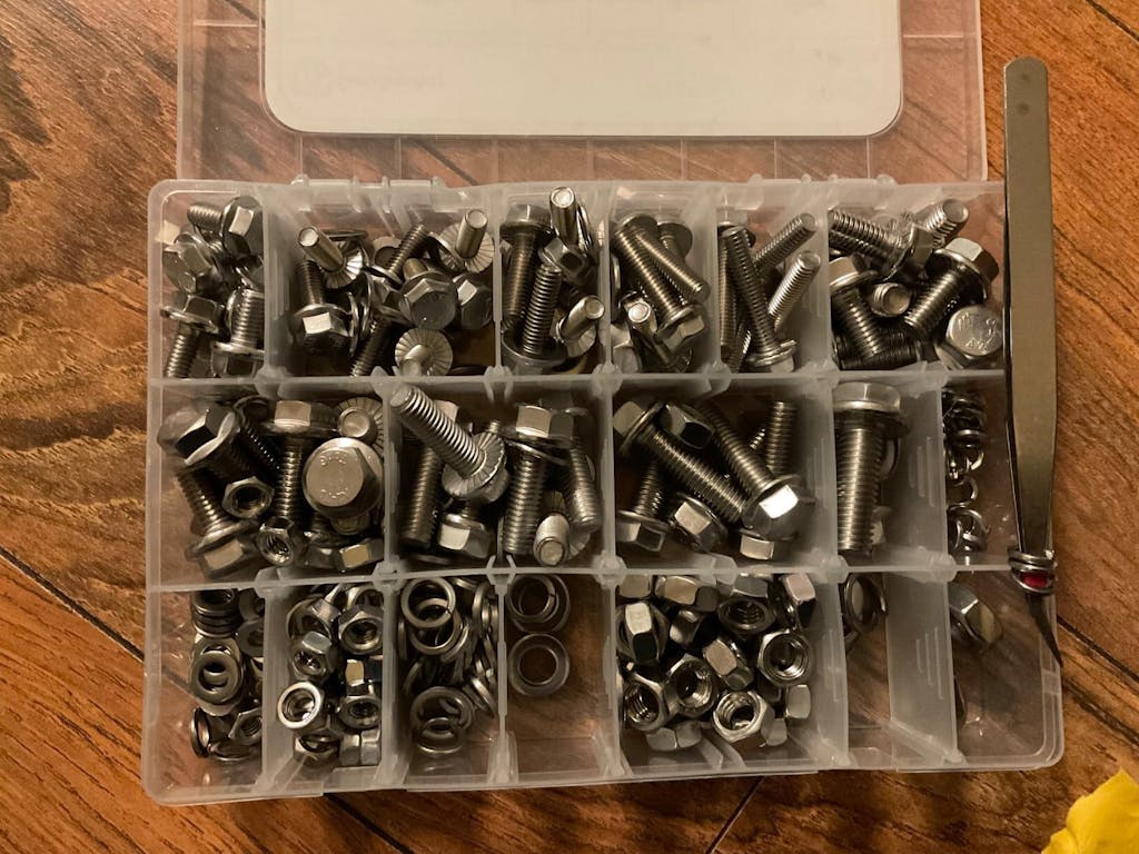 The bolts arrived a bit mixed up inside the case, but no matter, they seem high quality and it’s a great collection to keep handy for when you need a bolt-nut-washer set. No need to run to the hardware store for a single bolt. The case works great to keep everything together, but I’m not really sure what the included tweezers are for.