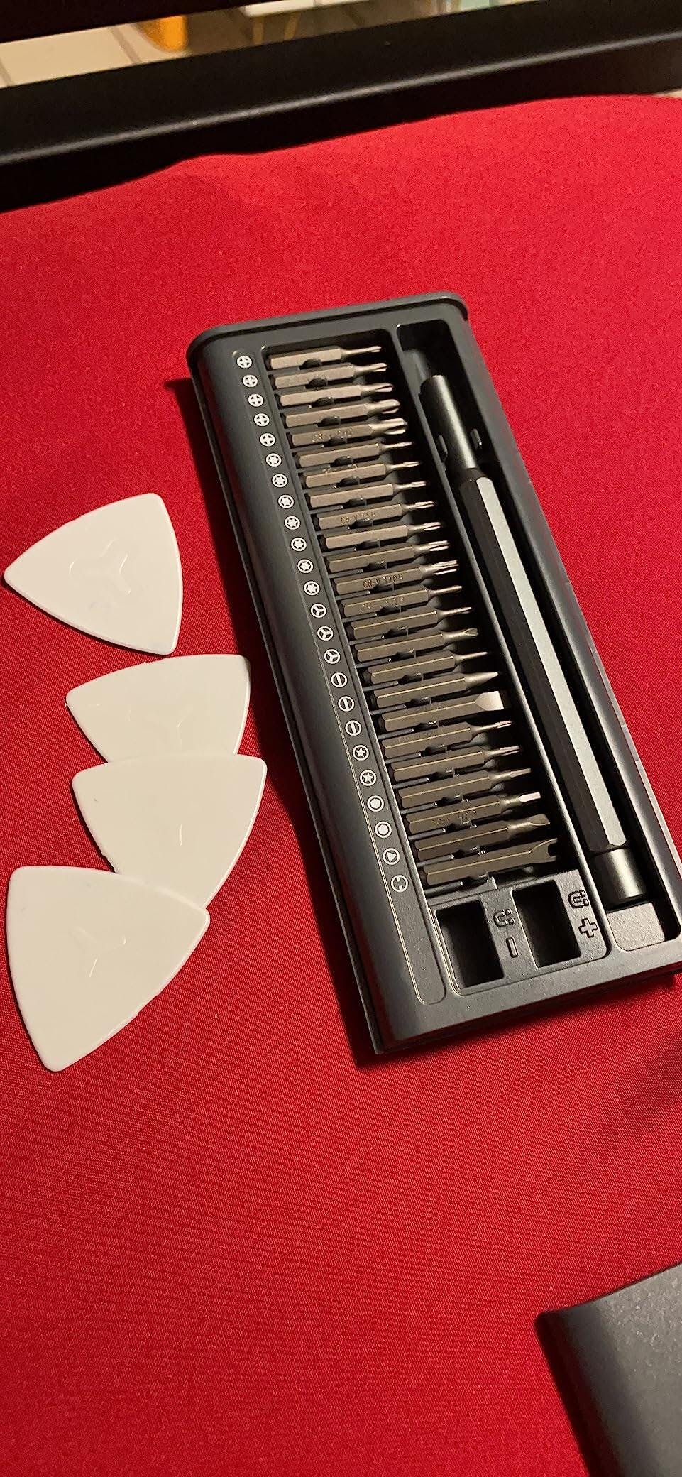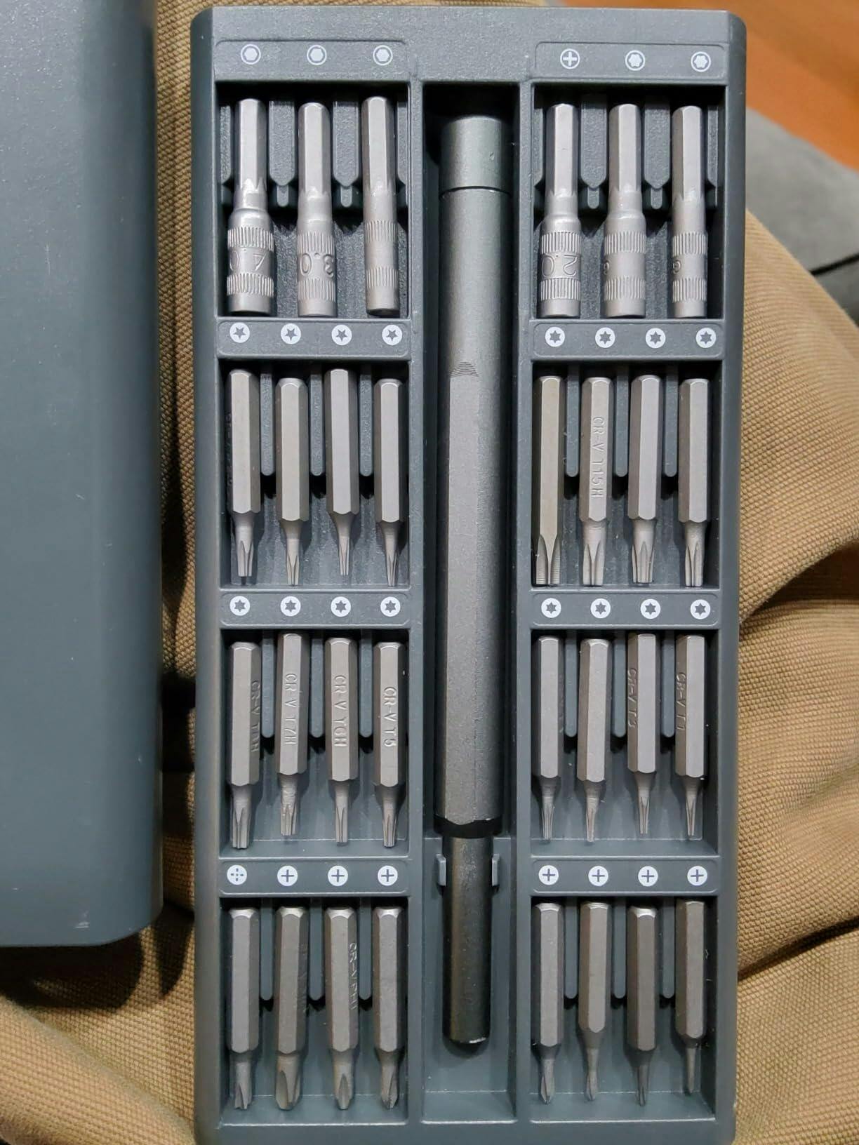 I needed the small bit to replace my laptops battery, it had the perfect size bit plus it came with 4 wedge tools. Highly recommend and it’s case is slim enough to store anywhere. Clever design on the end part, hold the end and spin for easy use.